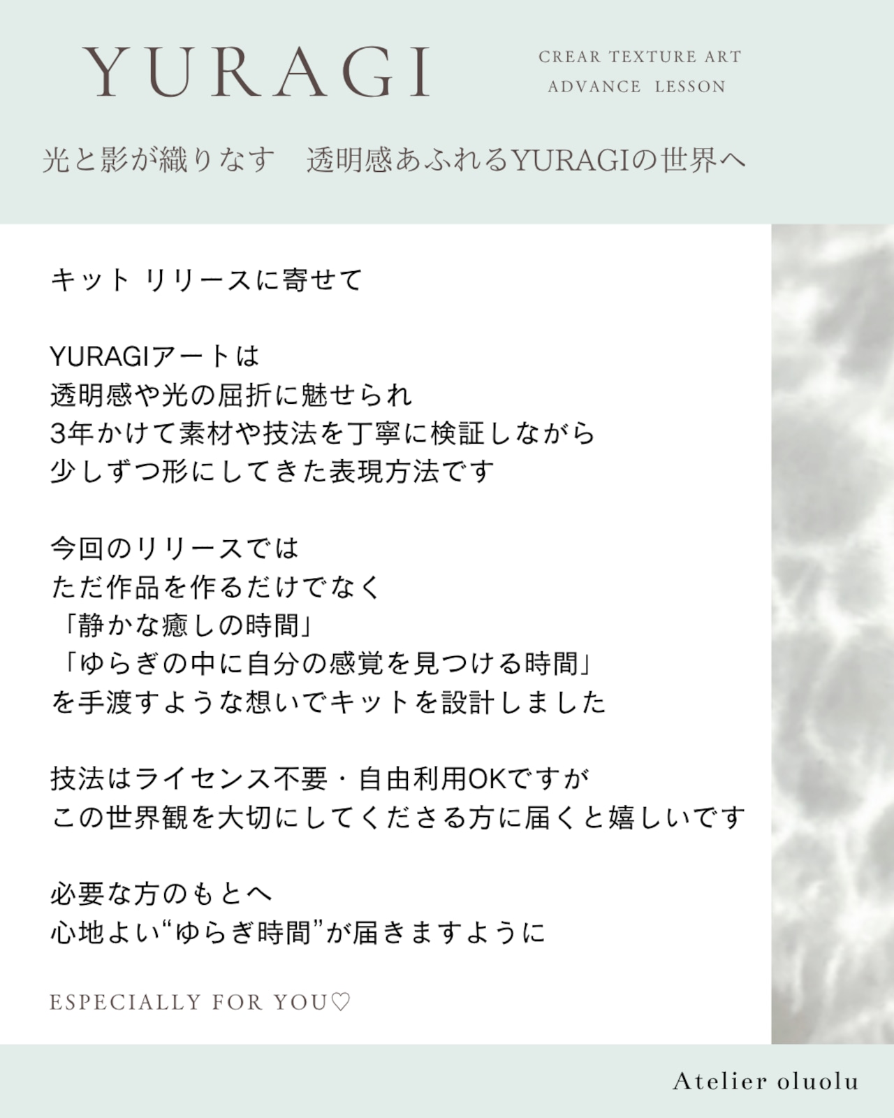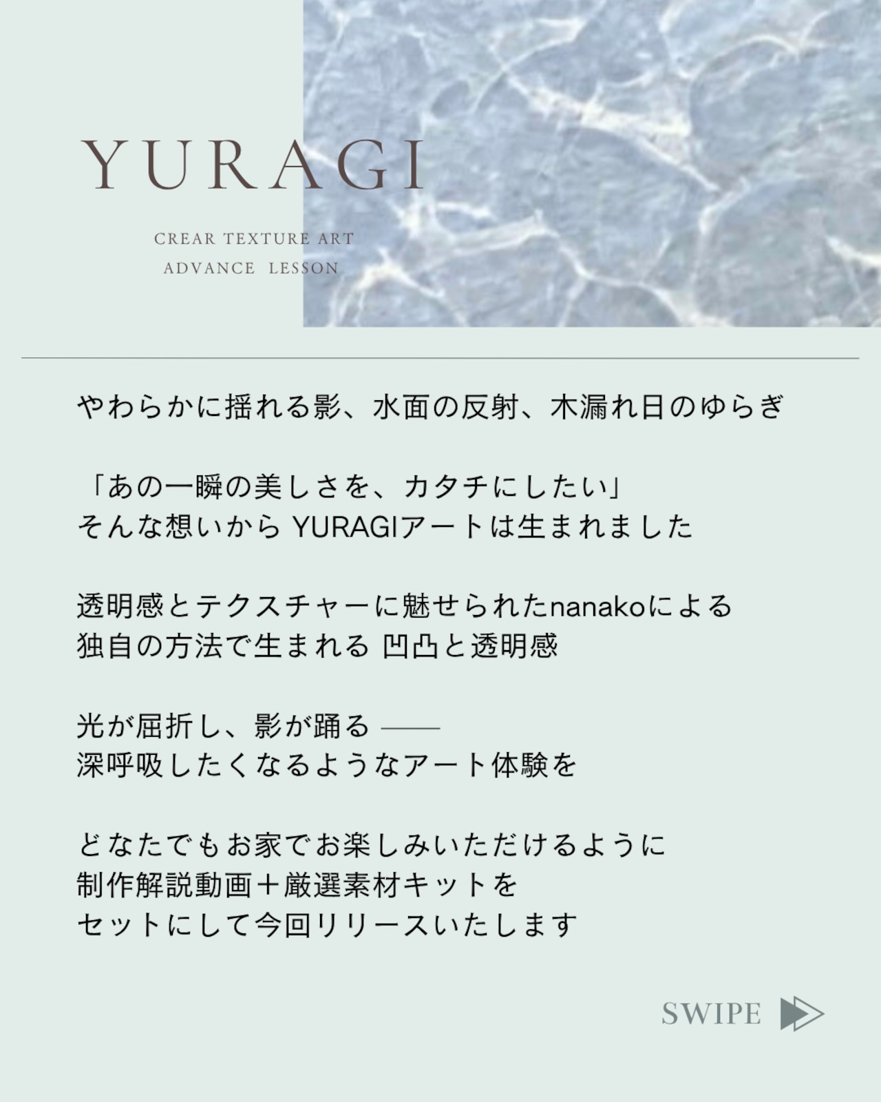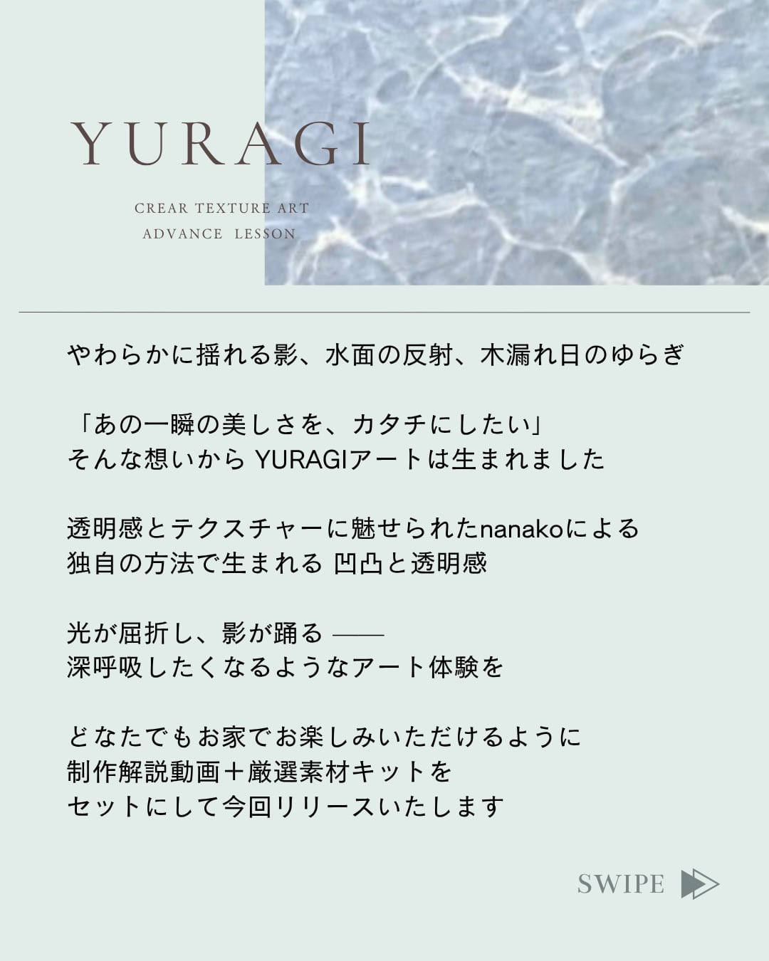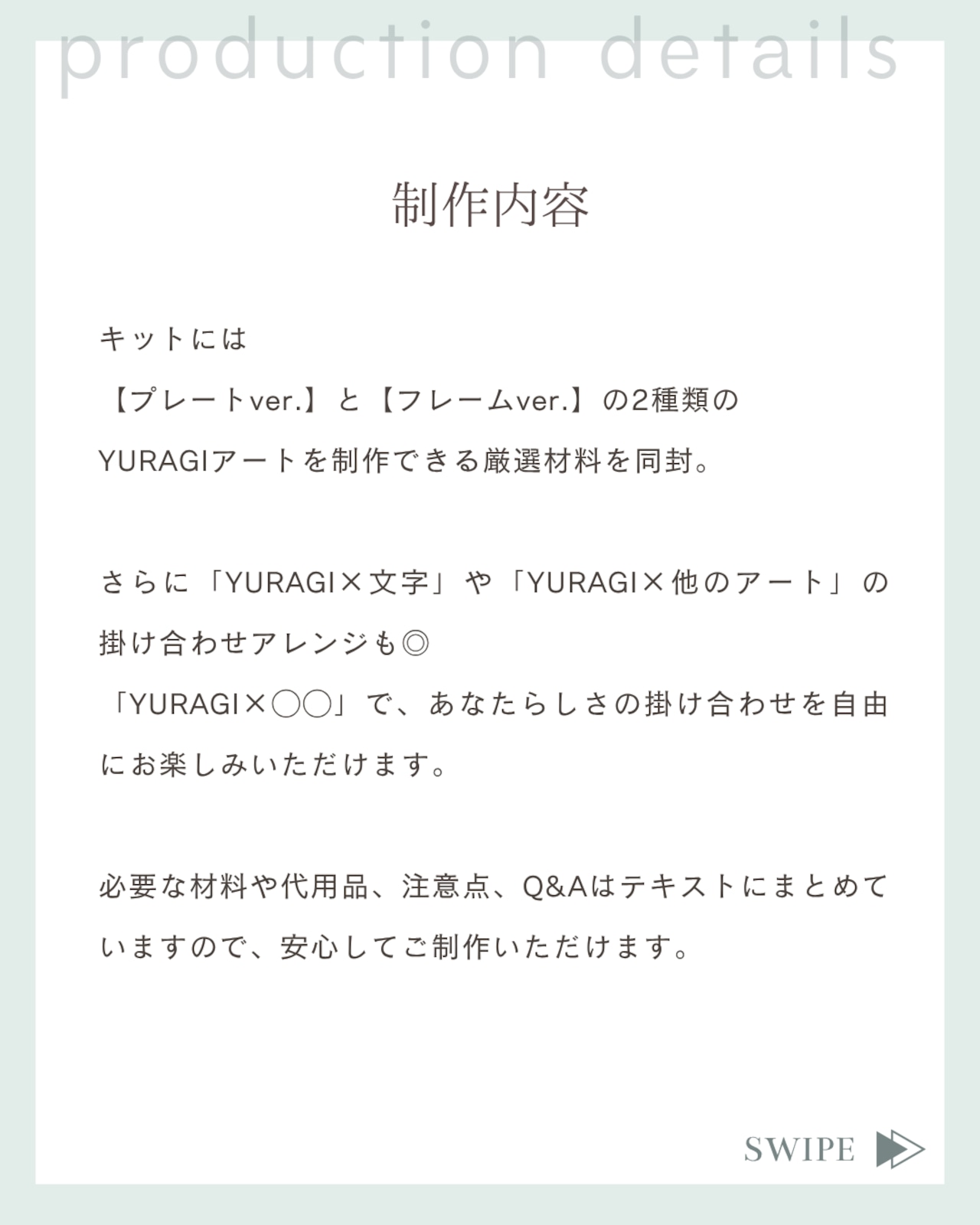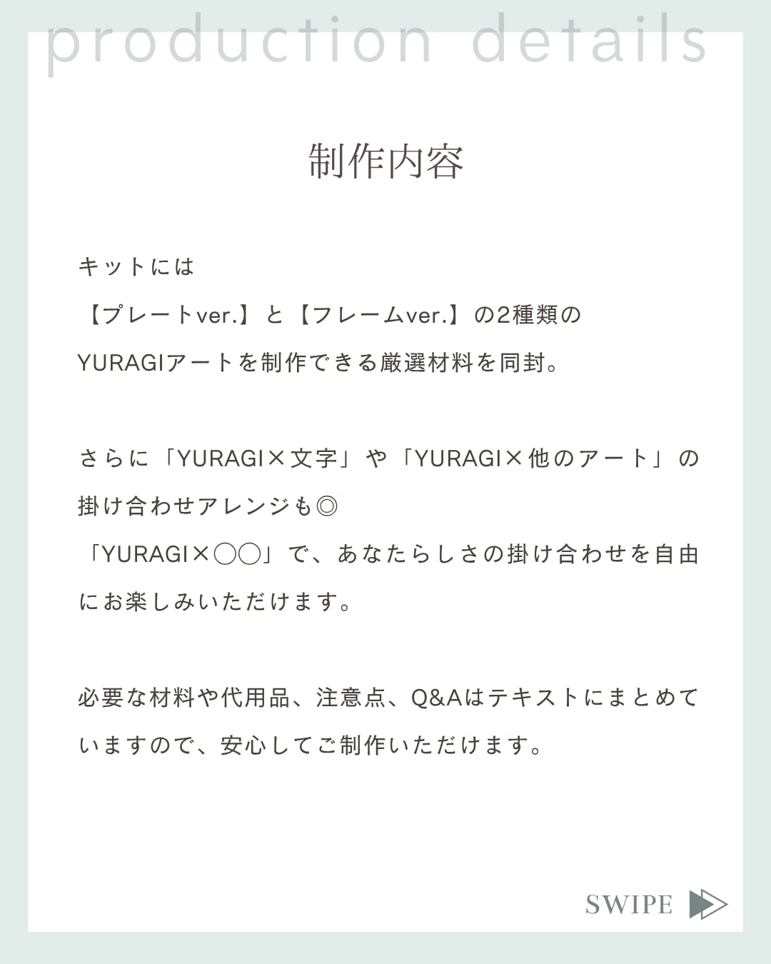 ・“YURAGI × 文字” “YURAGI × 他のアート”など、オリジナルアレンジも自由にお楽しみいただける内容です◎
