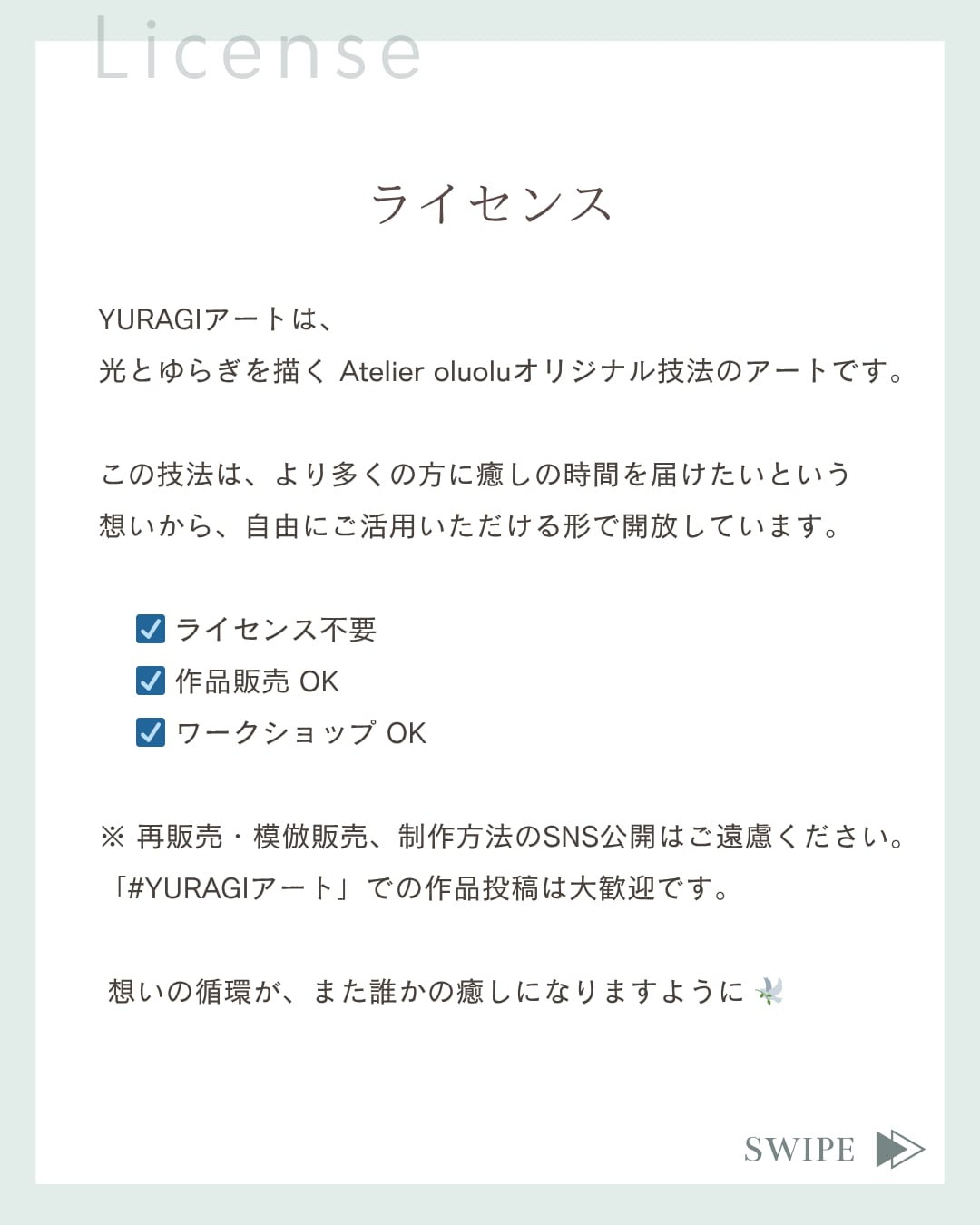 YURAGIアートの技法は、癒しの時間を広げることを目的にライセンスなしで開放しています。