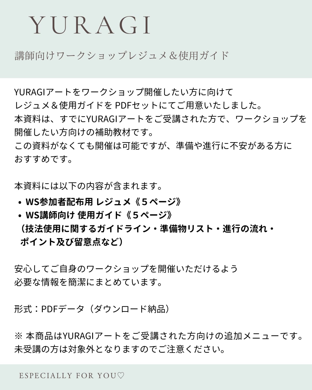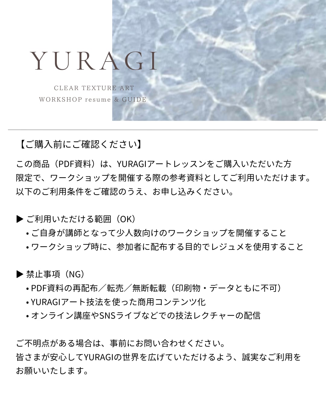 この商品(PDF資料)は、YURAGIアートレッスンをご購入いただいた方限定でワークショップを開催する際の参考資料としてご利用いただけます。